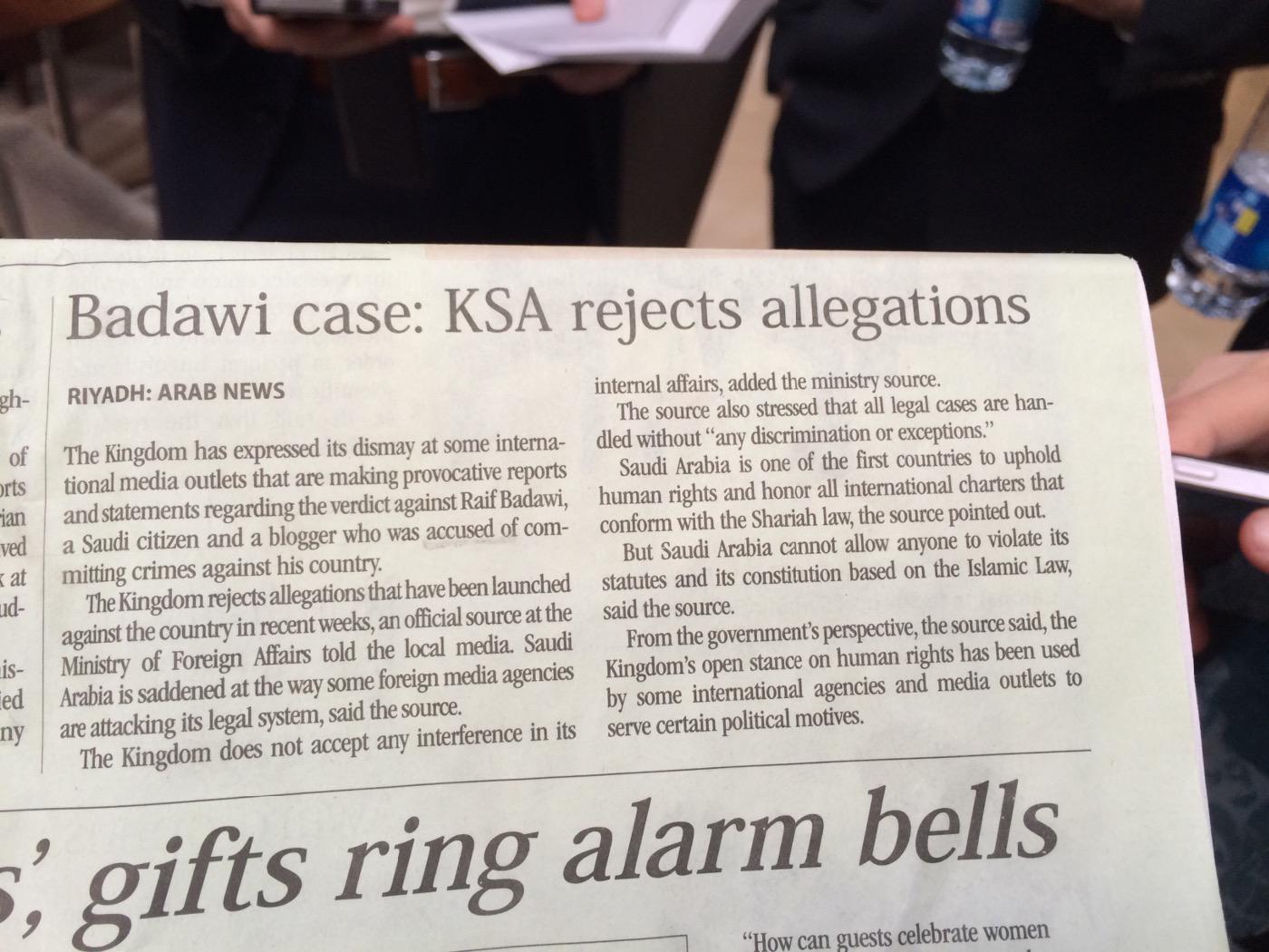 In der Zeitung Arab News heißt es heute, dass man im saudi-arabischen Außenministerium „bestürzt“ sei – nein, nicht über das barbarische Urteil, welches die Justiz des Landes über einen Blogger gefällt hat, sondern über den internationalen Aufschrei der Empörung, der „gewissen politischen Motiven“ folge. [Faksimile auf ZEIT online, hier]
